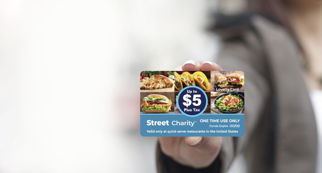 When you give through Street Charity, you help fund prepaid cards that can be used for a single transaction up to $5 plus tax at participating fast-food restaurants across the United States. Each card is loaded with meal support only—no cash or ATM access—so you know your generosity is going directly to food.